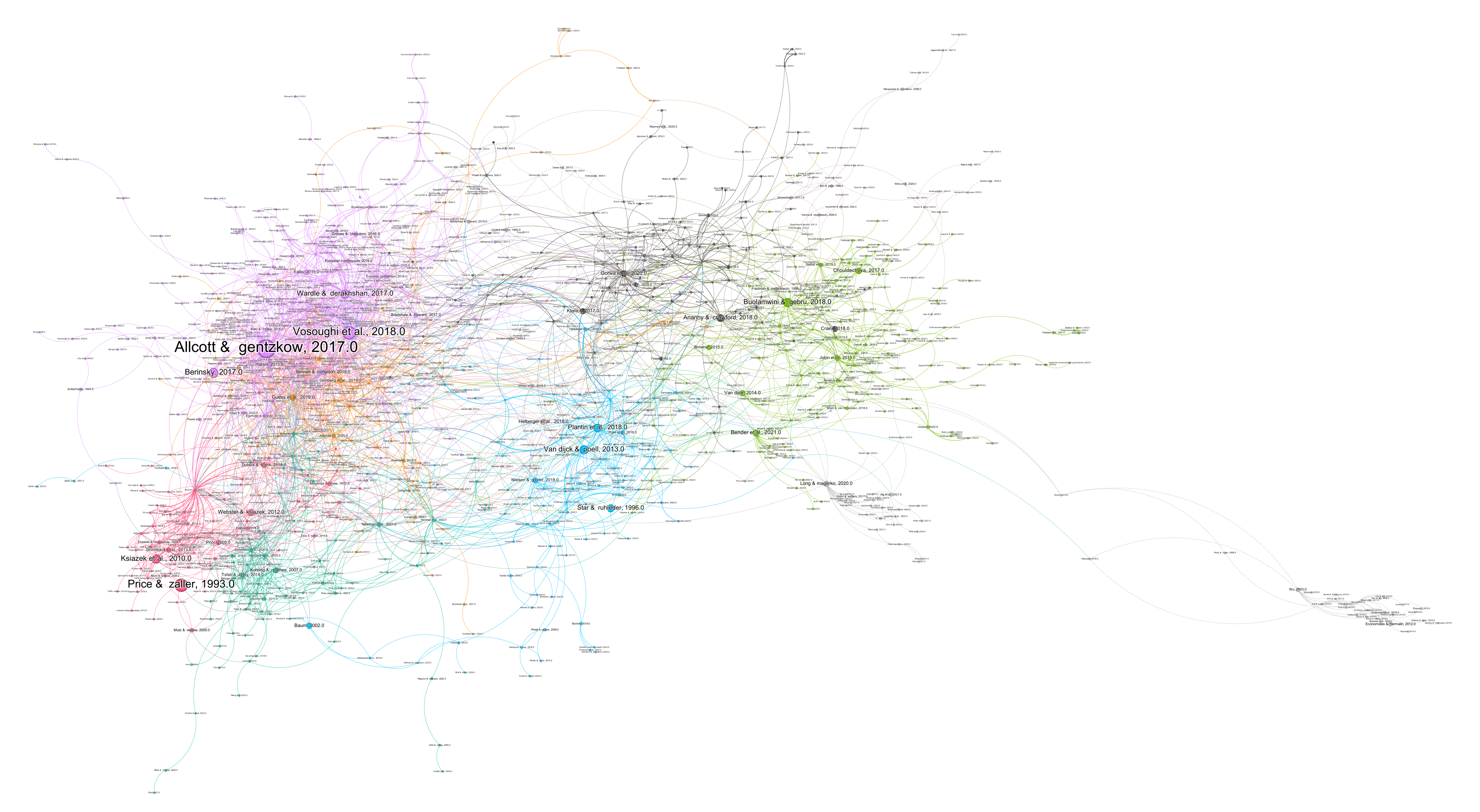 In this project in partnership with the Weizenbaum Institut, I map academic citations, co-authorship relations, and funding streams in of the literature on disinformation using traditional and LLM-based natural language processing. Preliminary results confirm that, in studying the societal effects of social media (especially in the dominating fields of communication, psychology, and political science), the field is highly influenced by the US academic tradition, and the study of its media and political system. On the other hand, European scholars are highly referenced in the study of data governance – often funded by public national and European public authorities. On average, scholars from the global majority world remain peripheric in the field. These trends seem to be reinforced by co-authorship and funding patterns.